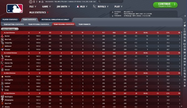 Note: There is no way to view multiple subleagues together on the Team Fielding page.